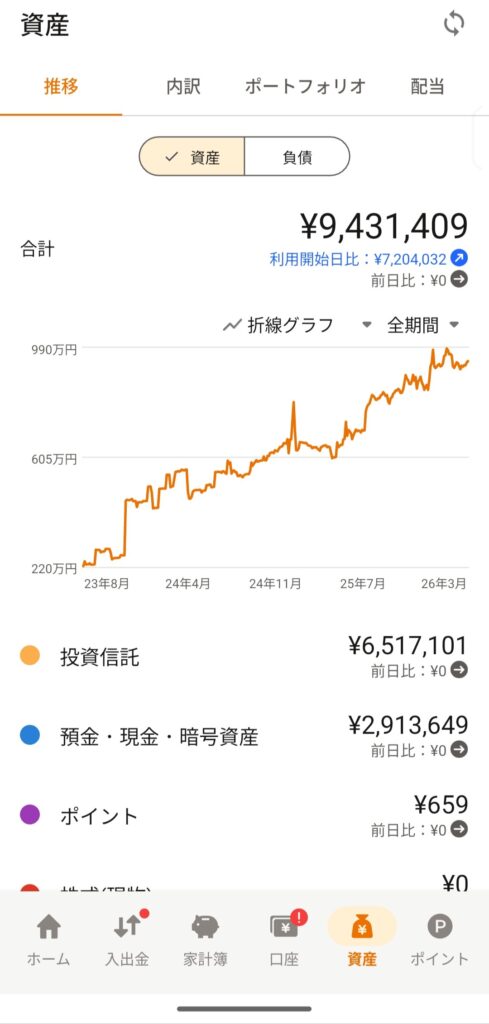 決意を形にすべく、22歳だった2023年1月から投資をスタートしました。現在、資産総額は9,431,409円に到達しています。